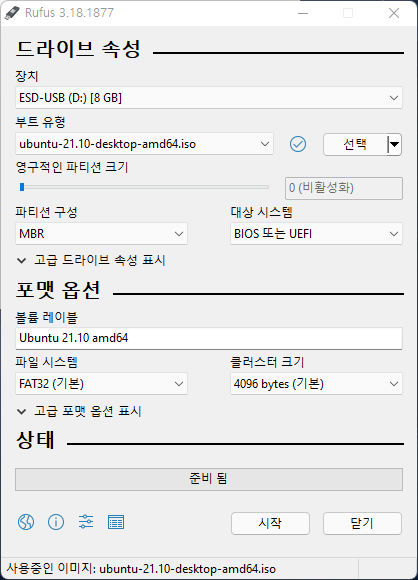 완성도 있는 LTS 버전을 받으셔도 좋고, 최신버전을 선택하셔도 됩니다. 저는 21.10 버전을 받았습니다.